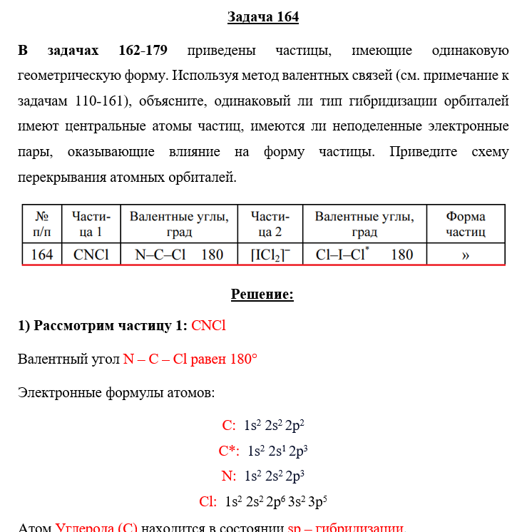 В задачах 162-179 приведены частицы, имеющие одинаковую геометрическую форму. Используя метод валентных связей (см. примечание к задачам 110-161), объясните, одинаковый ли тип гибридизации орбиталей имеют центральные атомы частиц, имеются ли неподеленные электронные пары, оказывающие влияние на форму частицы. Приведите схему перекрывания атомных орбиталей.