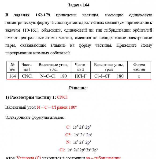 В задачах 162-179 приведены частицы, имеющие одинаковую геометрическую форму. Используя метод валентных связей (см. примечание к задачам 110-161), объясните, одинаковый ли тип гибридизации орбиталей имеют центральные атомы частиц, имеются ли неподеленные электронные пары, оказывающие влияние на форму частицы. Приведите схему перекрывания атомных орбиталей..