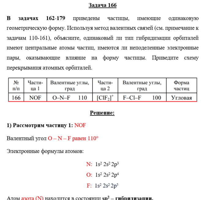 Задача 166 - приведены частицы, имеющие одинаковую геометрическую форму. Используя метод валентных связей (см. примечание к задачам 110-161), объясните, одинаковый ли тип гибридизации орбиталей имеют центральные атомы частиц, имеются ли неподеленные