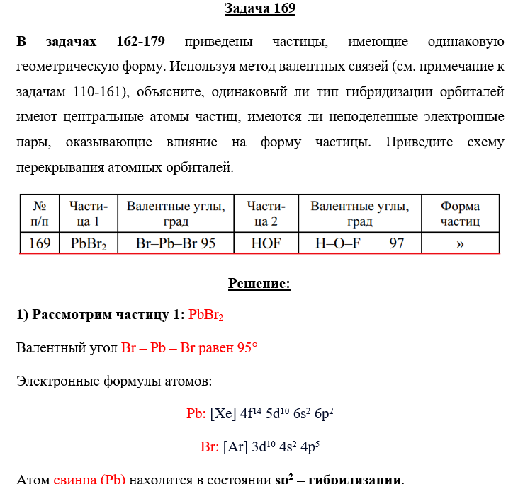 В задачах 162-179 приведены частицы, имеющие одинаковую геометрическую форму. Используя метод валентных связей (см. примечание к задачам 110-161), объясните, одинаковый ли тип гибридизации орбиталей имеют центральные атомы частиц, имеются ли неподеленные электронные пары, оказывающие влияние на форму частицы. Приведите схему перекрывания атомных орбиталей.