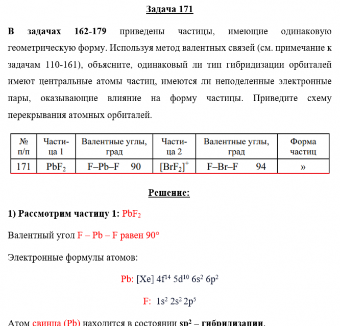 Задача 171 - приведены частицы, имеющие одинаковую геометрическую форму. Используя метод валентных связей (см. примечание к задачам 110-161), объясните, одинаковый ли тип гибридизации орбиталей имеют центральные атомы частиц, имеются ли неподеленные
