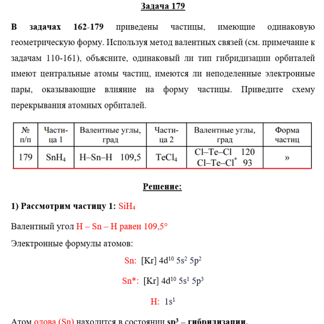 В задачах 162-179 приведены частицы, имеющие одинаковую геометрическую форму. Используя метод валентных связей (см. примечание к задачам 110-161), объясните, одинаковый ли тип гибридизации орбиталей имеют центральные атомы частиц, имеются ли неподеленные электронные пары, оказывающие влияние на форму частицы. Приведите схему перекрывания атомных орбиталей..