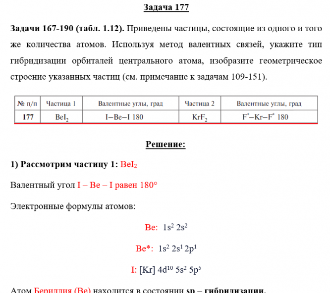 Задачи 167-190 (табл. 1.12). Приведены частицы, состоящие из одного и того же количества атомов. Используя метод валентных связей, укажите тип гибридизации орбиталей центрального атома, изобразите геометрическое строение указанных частиц (см. примечание к задачам 109-151).