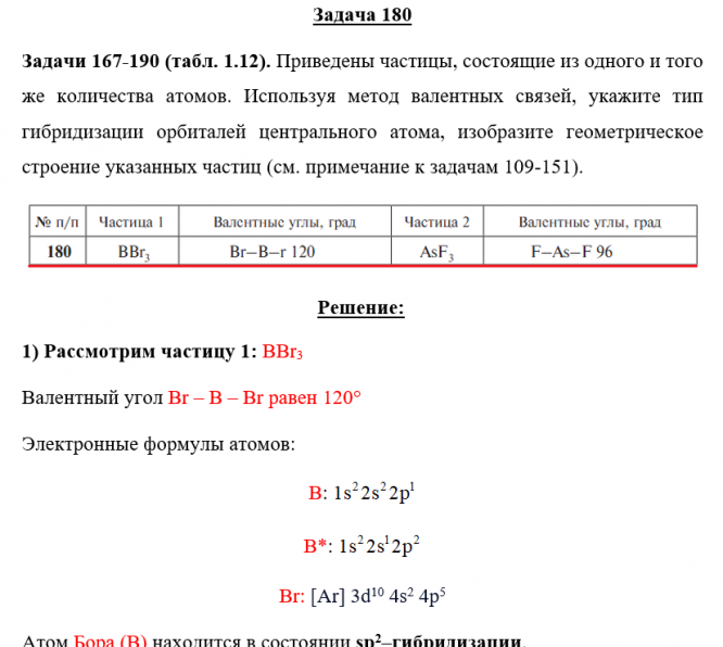 Задача 180 - Приведены частицы, состоящие из одного и того же количества атомов. Используя метод валентных связей, укажите тип гибридизации орбиталей центрального атома, изобразите геометрическое строение указанных частиц (см. примечание к задачам 10