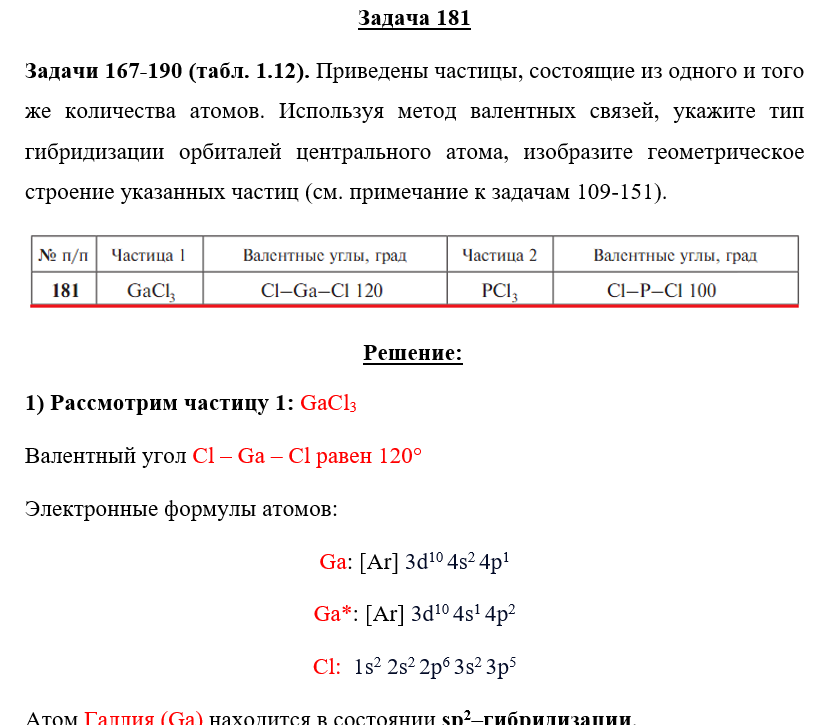Задачи 167-190 (табл. 1.12). Приведены частицы, состоящие из одного и того же количества атомов. Используя метод валентных связей, укажите тип гибридизации орбиталей центрального атома, изобразите геометрическое строение указанных частиц (см. примечание к задачам 109-151).