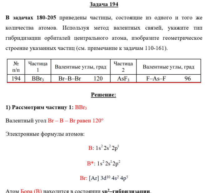 Задача 194 - приведены частицы, состоящие из одного и того же количества атомов. Используя метод валентных связей, укажите тип гибридизации орбиталей центрального атома, изобразите геометрическое строение указанных частиц (см. примечание к задачам 11