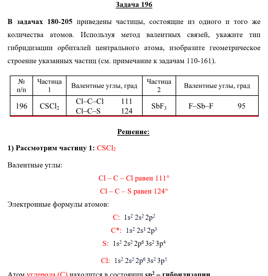 Задача 196 - приведены частицы, состоящие из одного и того же количества атомов. Используя метод валентных связей, укажите тип гибридизации орбиталей центрального атома, изобразите геометрическое строение указанных частиц (см. примечание к задачам 11