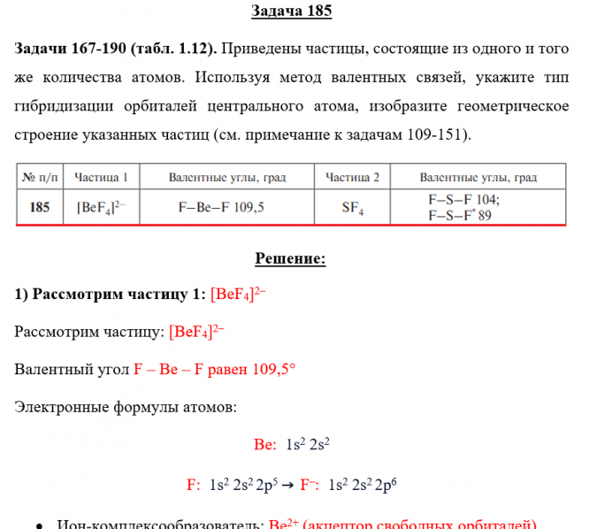 Задача 185 - Приведены частицы, состоящие из одного и того же количества атомов. Используя метод валентных связей, укажите тип гибридизации орбиталей центрального атома, изобразите геометрическое строение указанных частиц (см. примечание к задачам 10