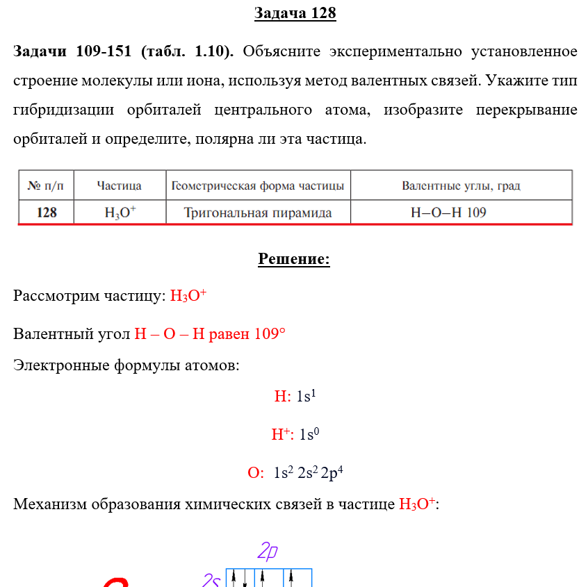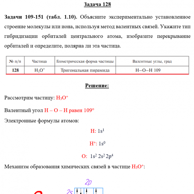 Для студентов по предмету ХимияЗадача 128 - Объясните экспериментально установленное строение молекулы или иона, используя метод валентных связей. Укажите тип гибридизации орбиталейЗадача 128 - Объясните экспериментально установленное строение молекулы или иона, используя метод валентных связей. Укажите тип гибридизации орбиталей