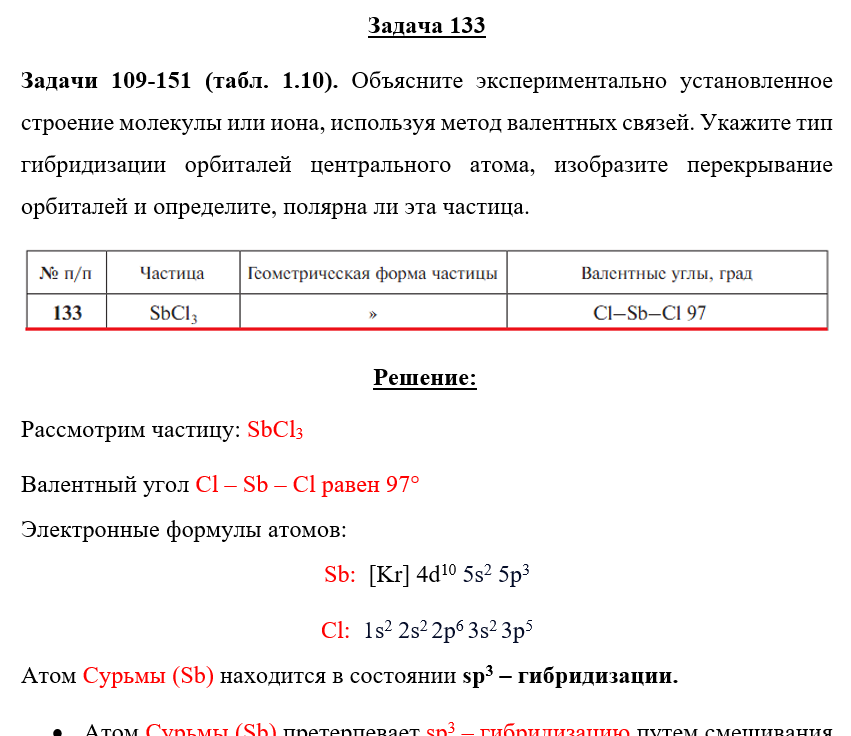 Для студентов по предмету ХимияЗадача 133 - Объясните экспериментально установленное строение молекулы или иона, используя метод валентных связей. Укажите тип гибридизации орбиталейЗадача 133 - Объясните экспериментально установленное строение молекулы или иона, используя метод валентных связей. Укажите тип гибридизации орбиталей