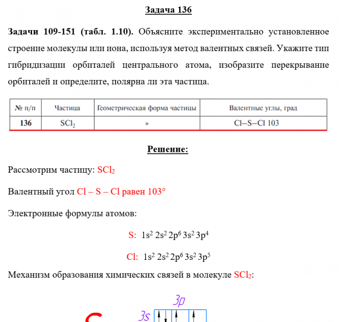 Задачи 109-151 (табл. 1.10). Объясните экспериментально установленное строение молекулы или иона, используя метод валентных связей. Укажите тип гибридизации орбиталей центрального атома, изобразите перекрывание орбиталей и определите, полярна ли эта частица.