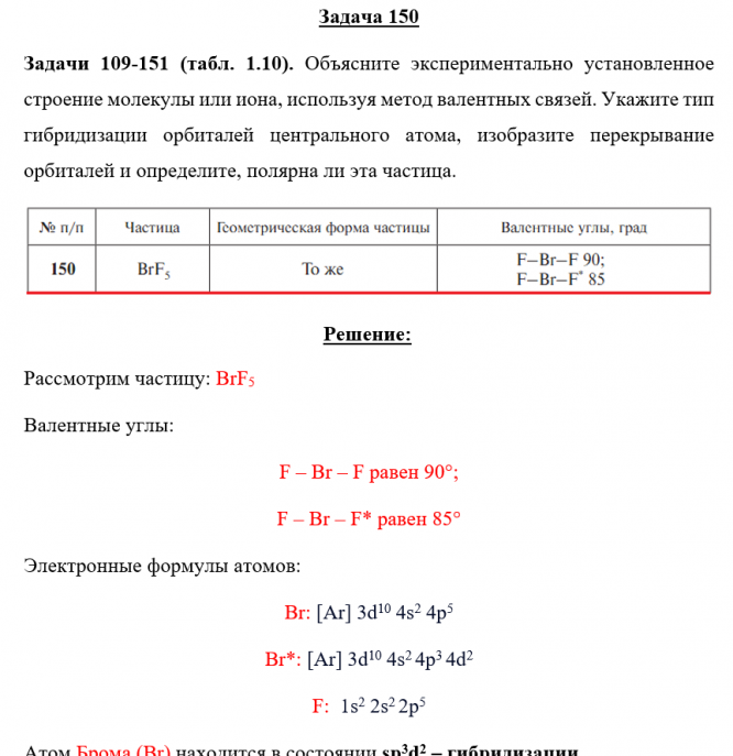 Задачи 109-151 (табл. 1.10). Объясните экспериментально установленное строение молекулы или иона, используя метод валентных связей. Укажите тип гибридизации орбиталей центрального атома, изобразите перекрывание орбиталей и определите, полярна ли эта частица.