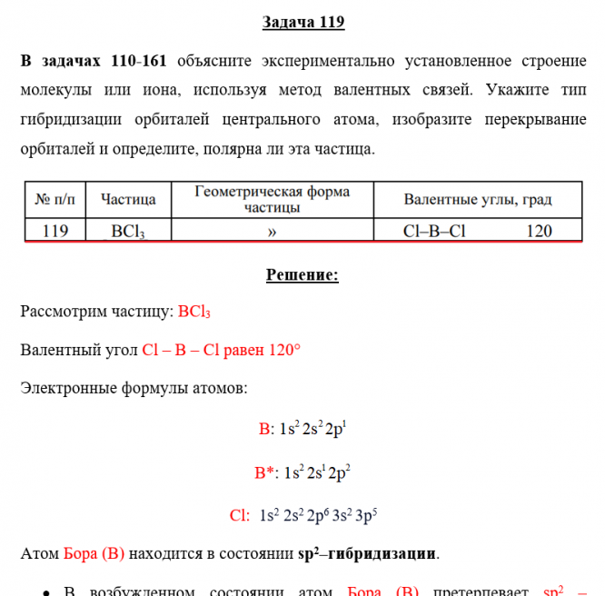 Задача 119 - объясните экспериментально установленное строение молекулы или иона, используя метод валентных связей. Укажите тип гибридизации орбиталей центрального атома, изобразите перекрывание орбиталей и определите, полярна ли эта частица.