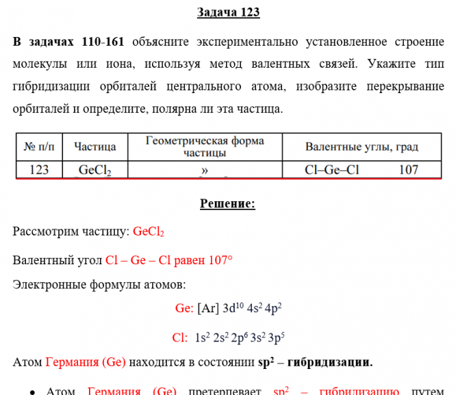 Задача 123 - объясните экспериментально установленное строение молекулы или иона, используя метод валентных связей. Укажите тип гибридизации орбиталей центрального атома, изобразите перекрывание орбиталей и определите, полярна ли эта частица.