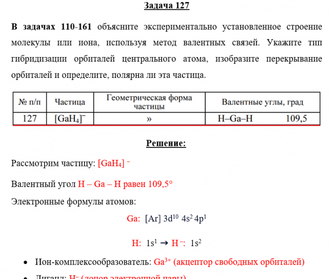 Задача 127 - объясните экспериментально установленное строение молекулы или иона, используя метод валентных связей. Укажите тип гибридизации орбиталей центрального атома, изобразите перекрывание орбиталей и определите, полярна ли эта частица.