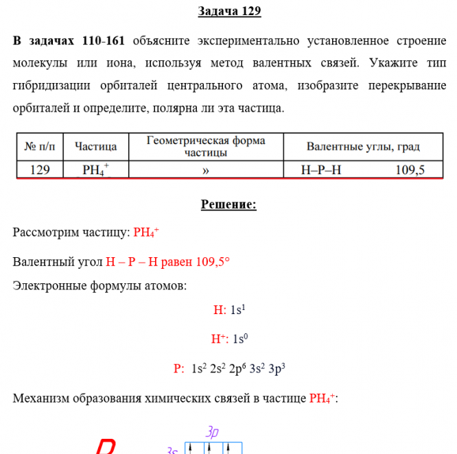 Задача 129 - объясните экспериментально установленное строение молекулы или иона, используя метод валентных связей. Укажите тип гибридизации орбиталей центрального атома, изобразите перекрывание орбиталей и определите, полярна ли эта частица.