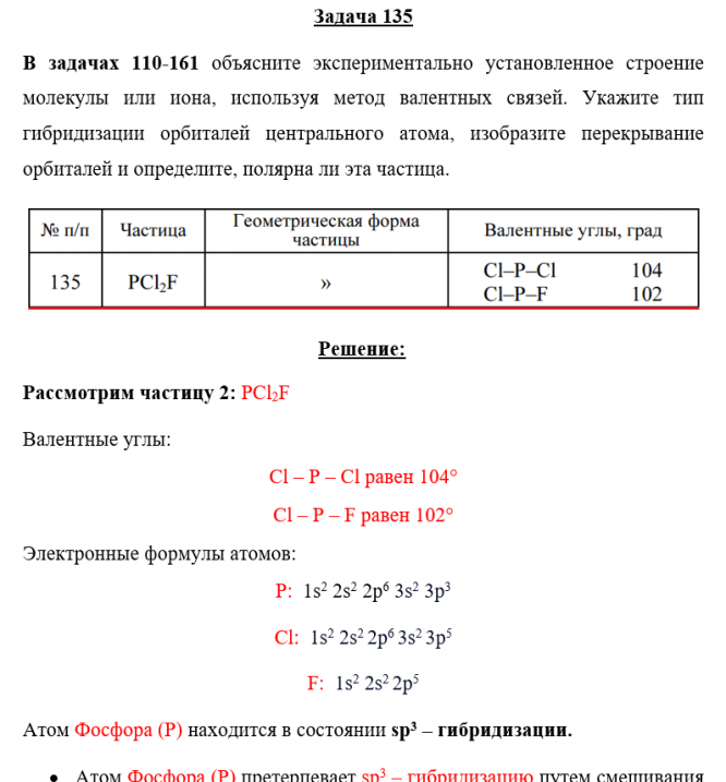 Задача 135 - объясните экспериментально установленное строение молекулы или иона, используя метод валентных связей. Укажите тип гибридизации орбиталей центрального атома, изобразите перекрывание орбиталей и определите, полярна ли эта частица.