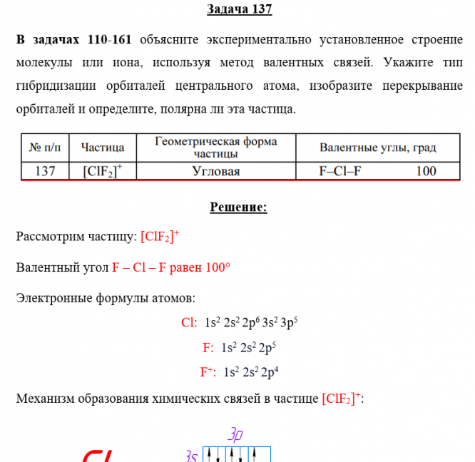 Задача 137 - объясните экспериментально установленное строение молекулы или иона, используя метод валентных связей. Укажите тип гибридизации орбиталей центрального атома, изобразите перекрывание орбиталей и определите, полярна ли эта частица.