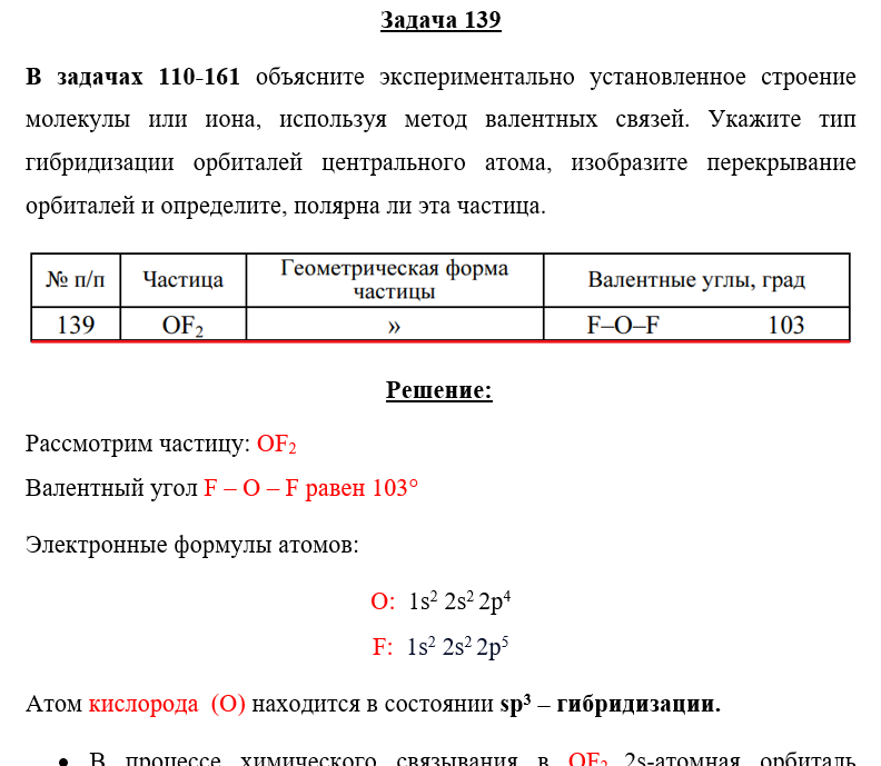 Задача 139 - объясните экспериментально установленное строение молекулы или иона, используя метод валентных связей. Укажите тип гибридизации орбиталей центрального атома, изобразите перекрывание орбиталей и определите, полярна ли эта частица.