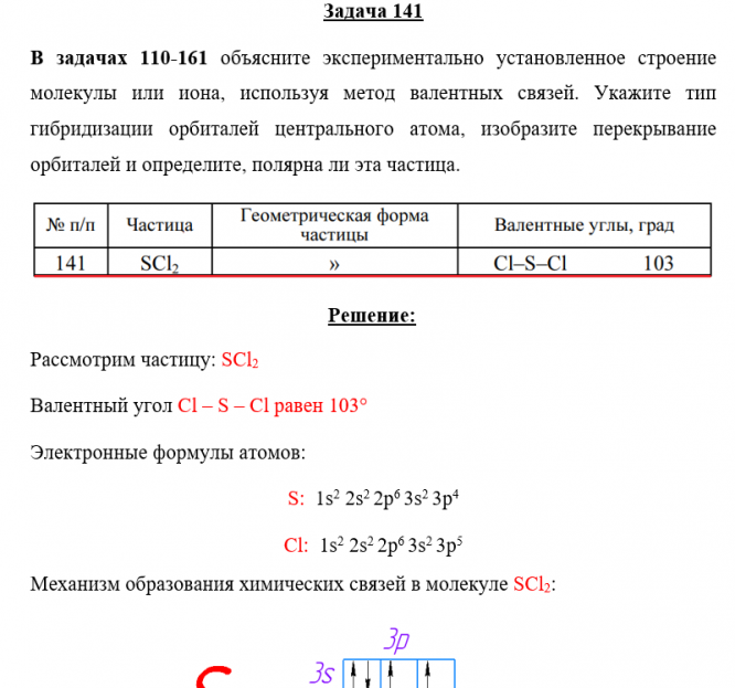 Задача 141 - объясните экспериментально установленное строение молекулы или иона, используя метод валентных связей. Укажите тип гибридизации орбиталей центрального атома, изобразите перекрывание орбиталей и определите, полярна ли эта частица.