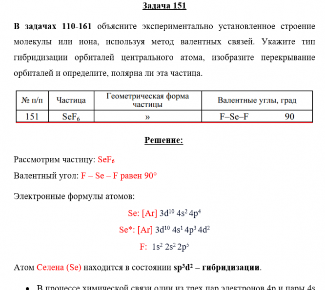 Задача 151 - объясните экспериментально установленное строение молекулы или иона, используя метод валентных связей. Укажите тип гибридизации орбиталей центрального атома, изобразите перекрывание орбиталей и определите, полярна ли эта частица.