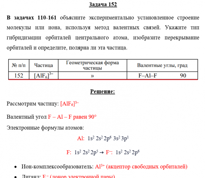 Задача 152 - объясните экспериментально установленное строение молекулы или иона, используя метод валентных связей. Укажите тип гибридизации орбиталей центрального атома, изобразите перекрывание орбиталей и определите, полярна ли эта частица.