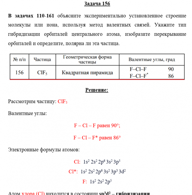 Задача 156 - объясните экспериментально установленное строение молекулы или иона, используя метод валентных связей. Укажите тип гибридизации орбиталей центрального атома, изобразите перекрывание орбиталей и определите, полярна ли эта частица.