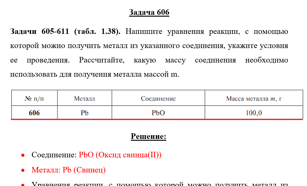 Задачи 605-611 (табл. 1.38). Напишите уравнения реакции, с помощью которой можно получить металл из указанного соединения, укажите условия ее проведения. Рассчитайте, какую массу соединения необходимо использовать для получения металла массой m.