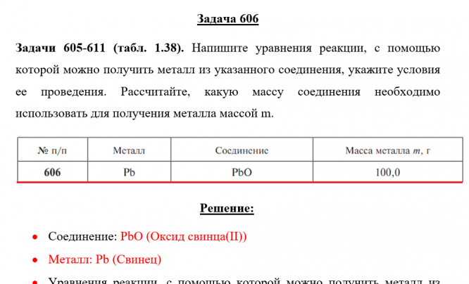 Задачи 605-611 (табл. 1.38). Напишите уравнения реакции, с помощью которой можно получить металл из указанного соединения, укажите условия ее проведения. Рассчитайте, какую массу соединения необходимо использовать для получения металла массой m. .