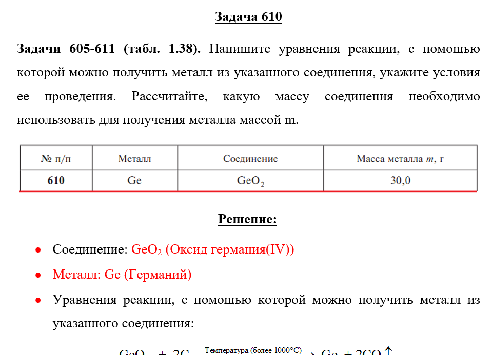 Задачи 605-611 (табл. 1.38). Напишите уравнения реакции, с помощью которой можно получить металл из указанного соединения, укажите условия ее проведения. Рассчитайте, какую массу соединения необходимо использовать для получения металла массой m. .