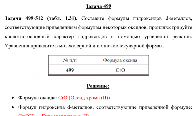 Задача 499 - Составьте формулы гидроксидов d-металлов, соответствующие приведенным формулам некоторых оксидов; проиллюстрируйте кислотно-основный характер гидроксидов с помощью уравнений реакций. Уравнения приведите в молекулярной и ионно-молекулярно