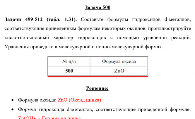 Главная » Учебные материалы » Химия » Решения задач » Несколько классов/семестров » Номер 500 » Задача 500 - Составьте формулы гидроксидов d-металлов, соответствующие приведенным формулам некоторых оксидов; проиллюстрируйте кислотно-основный характер гидроксидов с помощью уравнений реакций. Уравнения приведите в молекулярной и ионно-молекулярно