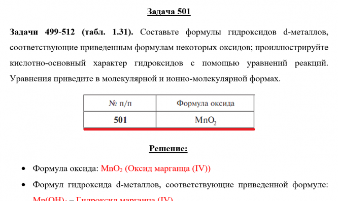 Задача 501 - Составьте формулы гидроксидов d-металлов, соответствующие приведенным формулам некоторых оксидов; проиллюстрируйте кислотно-основный характер гидроксидов с помощью уравнений реакций. Уравнения приведите в молекулярной и ионно-молекулярно