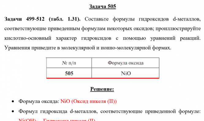 Задача 505 - Составьте формулы гидроксидов d-металлов, соответствующие приведенным формулам некоторых оксидов; проиллюстрируйте кислотно-основный характер гидроксидов с помощью уравнений реакций. Уравнения приведите в молекулярной и ионно-молекулярно