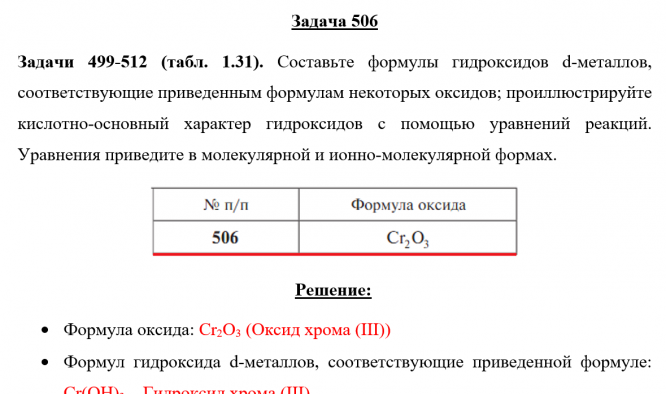 Задача 506 - Составьте формулы гидроксидов d-металлов, соответствующие приведенным формулам некоторых оксидов; проиллюстрируйте кислотно-основный характер гидроксидов с помощью уравнений реакций. Уравнения приведите в молекулярной и ионно-молекулярно