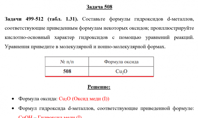 Задача 508 - Составьте формулы гидроксидов d-металлов, соответствующие приведенным формулам некоторых оксидов; проиллюстрируйте кислотно-основный характер гидроксидов с помощью уравнений реакций. Уравнения приведите в молекулярной и ионно-молекулярно