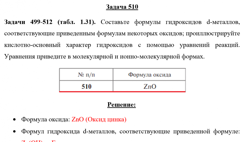 Задача 510 - Составьте формулы гидроксидов d-металлов, соответствующие приведенным формулам некоторых оксидов; проиллюстрируйте кислотно-основный характер гидроксидов с помощью уравнений реакций. Уравнения приведите в молекулярной и ионно-молекулярно