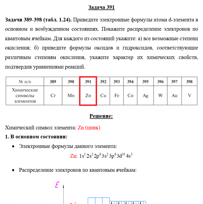 Задача 391 - Приведите электронные формулы атома d-элемента в основном и возбужденном состояниях. Покажите распределение электронов по квантовым ячейкам. Для каждого из состояний укажите: а) все возможные степени окисления; б) приведите формулы оксид