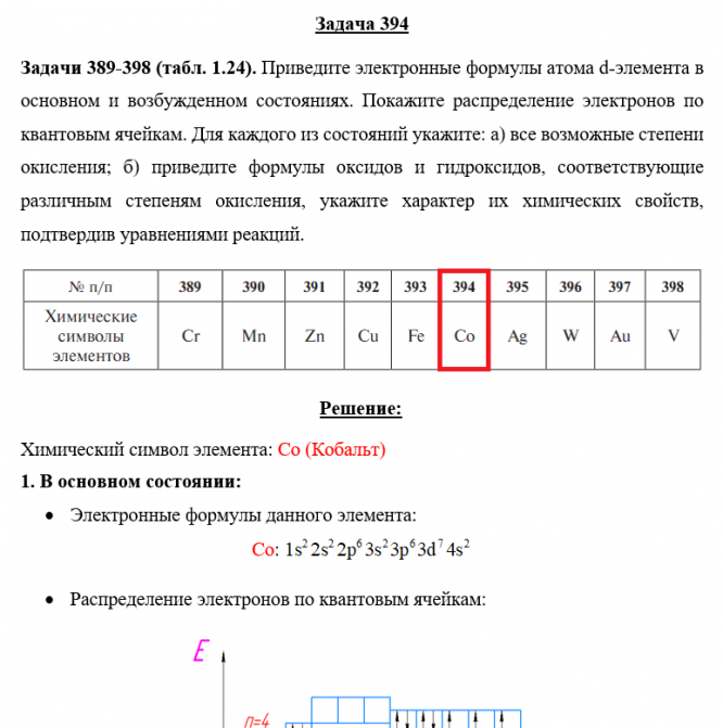 Задача 394 - Приведите электронные формулы атома d-элемента в основном и возбужденном состояниях. Покажите распределение электронов по квантовым ячейкам. Для каждого из состояний укажите: а) все возможные степени окисления; б) приведите формулы оксид