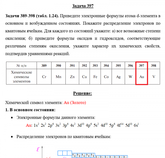 Задача 397 - Приведите электронные формулы атома d-элемента в основном и возбужденном состояниях. Покажите распределение электронов по квантовым ячейкам. Для каждого из состояний укажите: а) все возможные степени окисления; б) приведите формулы оксид