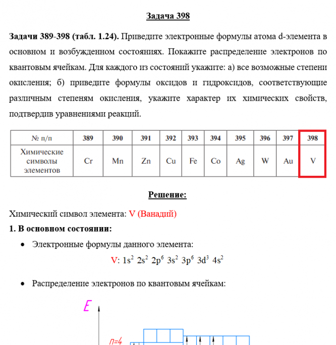 Задача 398 - Приведите электронные формулы атома d-элемента в основном и возбужденном состояниях. Покажите распределение электронов по квантовым ячейкам. Для каждого из состояний укажите: а) все возможные степени окисления; б) приведите формулы оксид