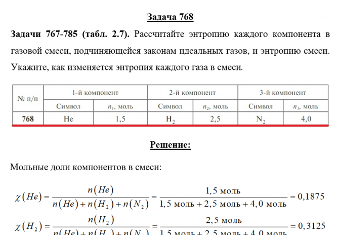 Задачи 767-785 (табл. 2.7). Рассчитайте энтропию каждого компонента в газовой смеси, подчиняющейся законам идеальных газов, и энтропию смеси. Укажите, как изменяется энтропия каждого газа в смеси..