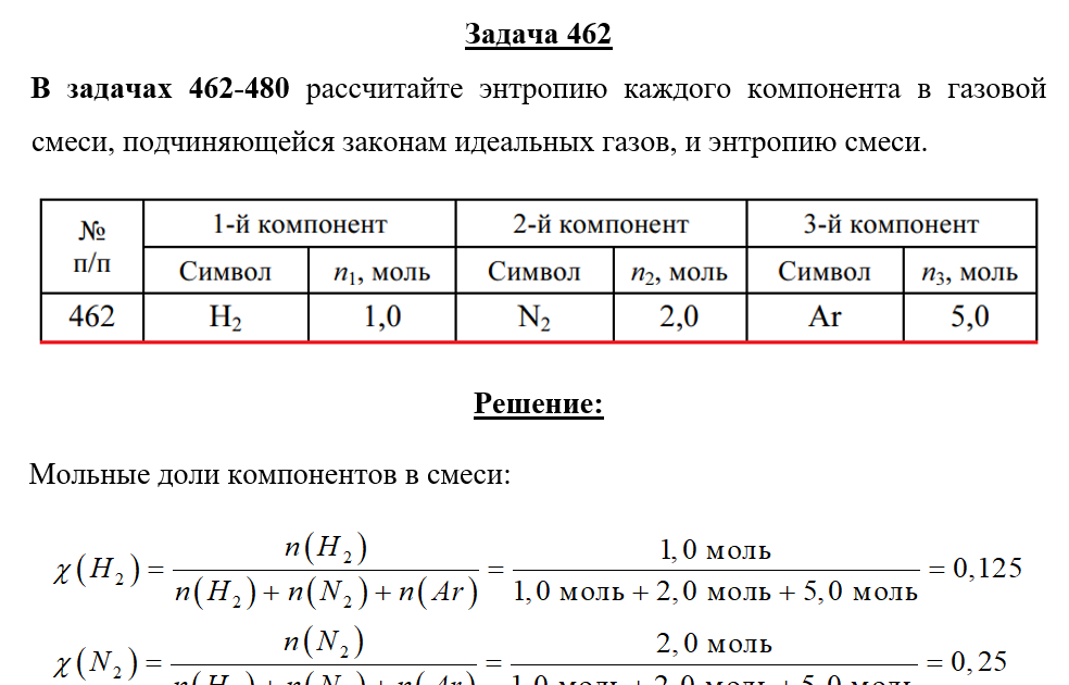 Задача 462 - рассчитайте энтропию каждого компонента в газовой смеси, подчиняющейся законам идеальных газов, и энтропию смеси.
