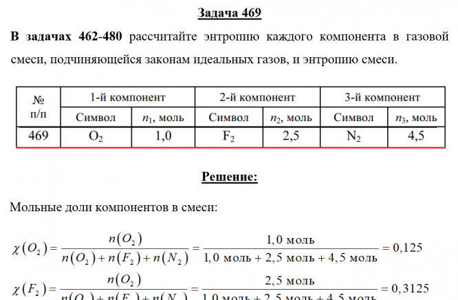 Задача 469 - рассчитайте энтропию каждого компонента в газовой смеси, подчиняющейся законам идеальных газов, и энтропию смеси.