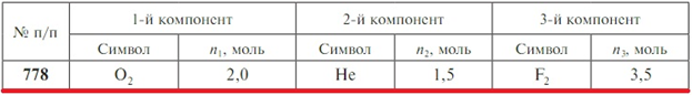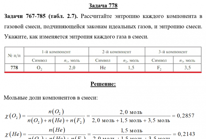 Задачи 767-785 (табл. 2.7). Рассчитайте энтропию каждого компонента в газовой смеси, подчиняющейся законам идеальных газов, и энтропию смеси. Укажите, как изменяется энтропия каждого газа в смеси..