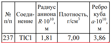 Задача 237 - определите, используя приведенные ниже экспериментальные данные, структурный тип кристаллической решетки, в которой кристаллизуется данное вещество (структурный тип NaCl или CsCl), рассчитайте ионный радиус катиона, изобразите элементарн