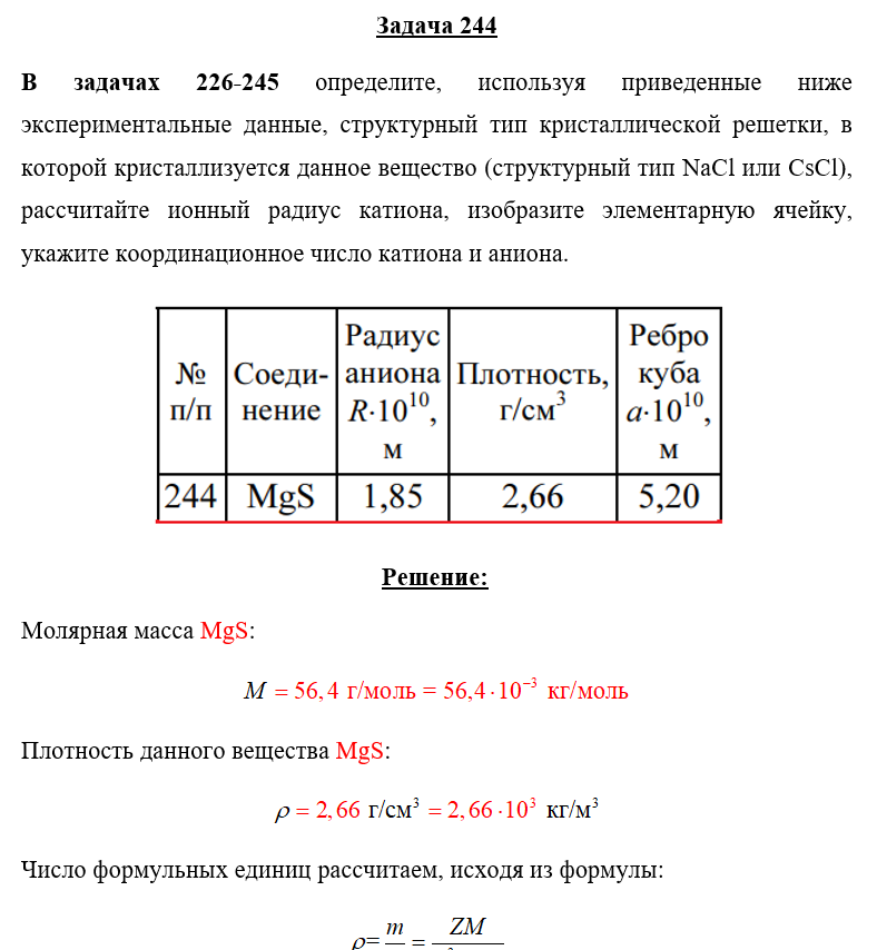 Задача 244 - определите, используя приведенные ниже экспериментальные данные, структурный тип кристаллической решетки, в которой кристаллизуется данное вещество (структурный тип NaCl или CsCl), рассчитайте ионный радиус катиона, изобразите элементарн