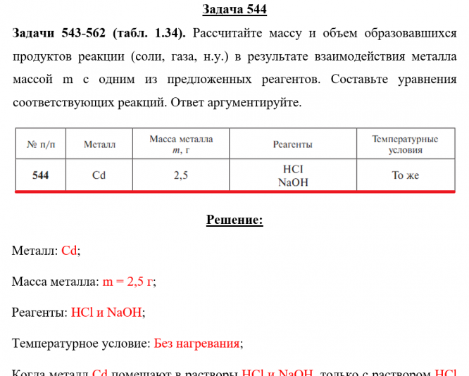 Задачи 543-562 (табл. 1.34). Рассчитайте массу и объем образовавшихся продуктов реакции (соли, газа, н.у.) в результате взаимодействия металла массой m с одним из предложенных реагентов. Составьте уравнения соответствующих реакций. Ответ аргументируйте..