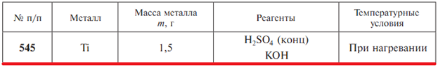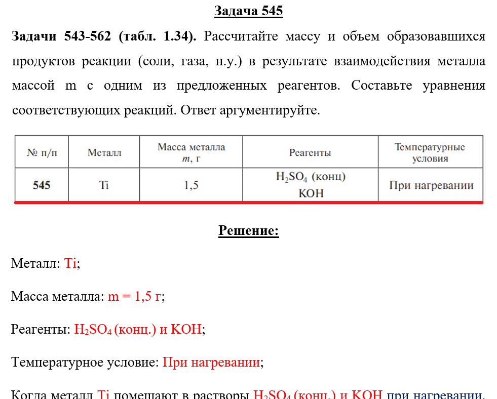 Задачи 543-562 (табл. 1.34). Рассчитайте массу и объем образовавшихся продуктов реакции (соли, газа, н.у.) в результате взаимодействия металла массой m с одним из предложенных реагентов. Составьте уравнения соответствующих реакций. Ответ аргументируйте.