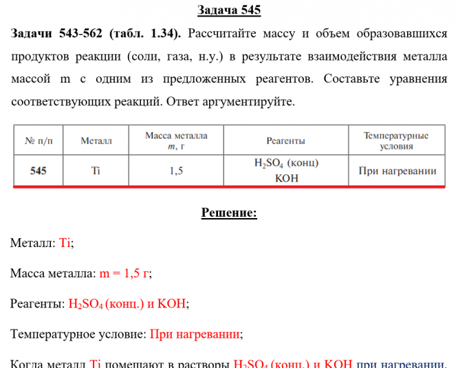 Задачи 543-562 (табл. 1.34). Рассчитайте массу и объем образовавшихся продуктов реакции (соли, газа, н.у.) в результате взаимодействия металла массой m с одним из предложенных реагентов. Составьте уравнения соответствующих реакций. Ответ аргументируйте..